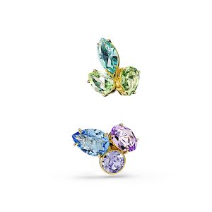 ARETES GEMA. Diseño asimétrico, Cortes mixtos, Multicolor, Baño en tono dorado.