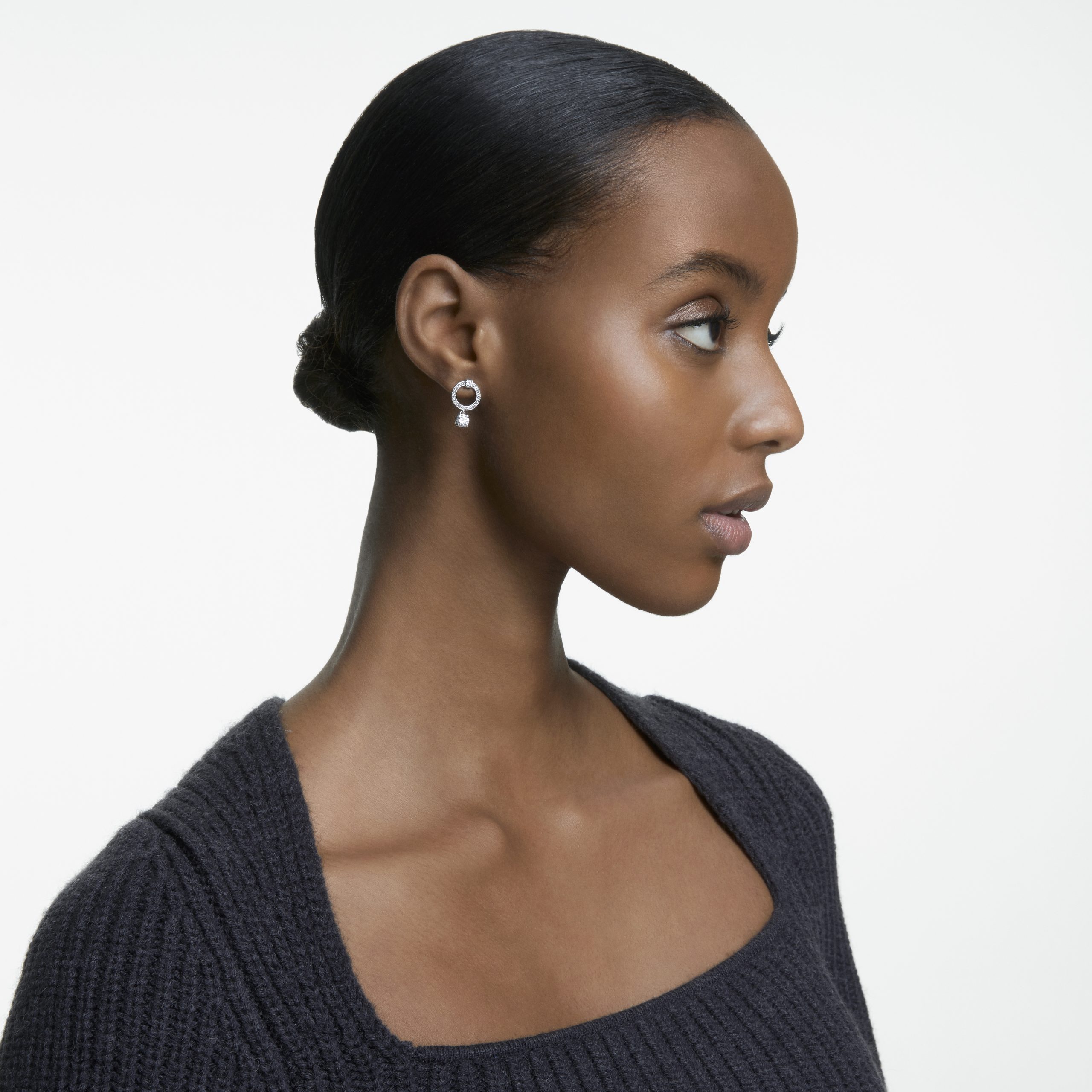 Este par de aretes de Swarovski es sencillo pero brillante. Una piedra redonda de color blanco cuelga de un aro pequeño que está bellamente adornado con brillante pavé. Los elementos colgantes se mueven cada vez que giras la cabeza, reflejando la luz de forma cambiante y brillante. Estos atractivos pendientes añaden un brillo único a los atuendos de diario.
