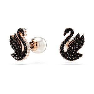 Pendientes de botón Swan, Perla de cristal, Cisne, Negros, Baño tono oro rosa